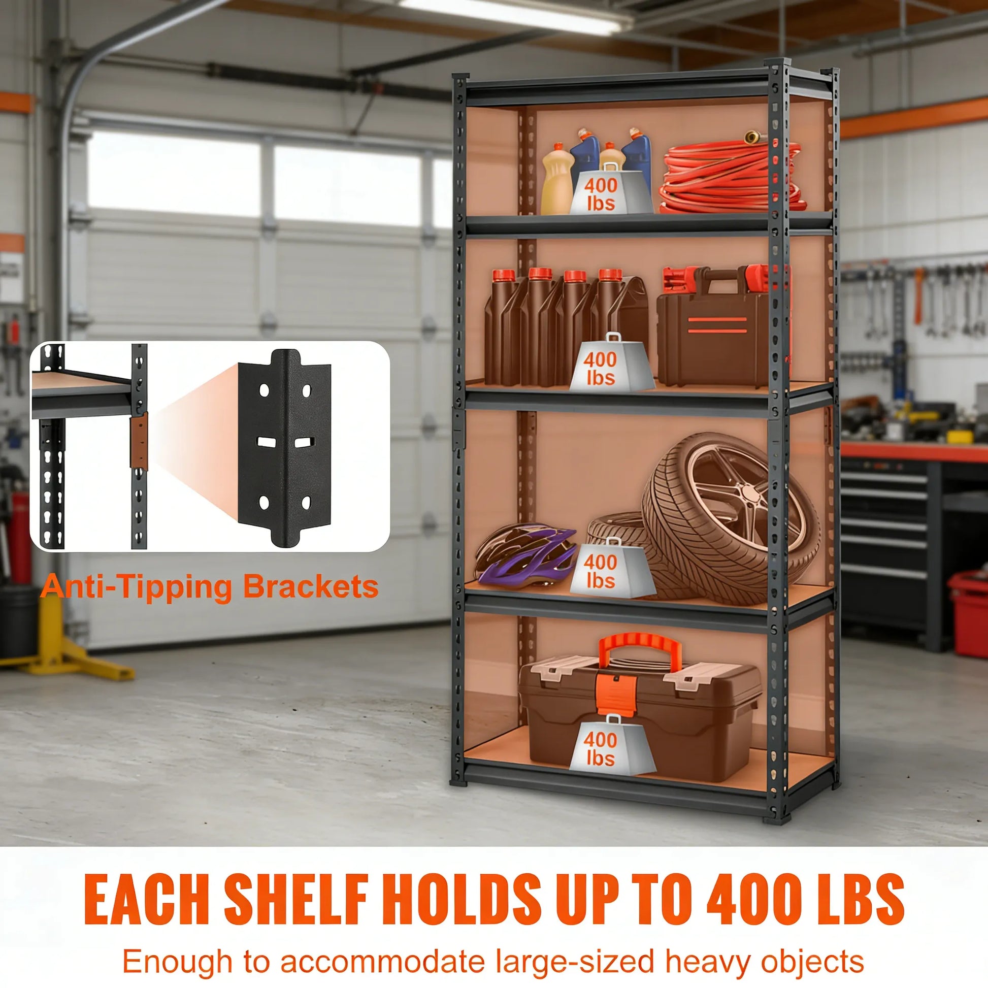 Organize Your Space – Turn your crowded garage into a tidy, well-organized area with this storage shelving unit. With a total weight capacity of 2000 lbs, you can confidently store tools, supplies, and other items in your garage or warehouse. Each shelf supports up to 400 pounds.