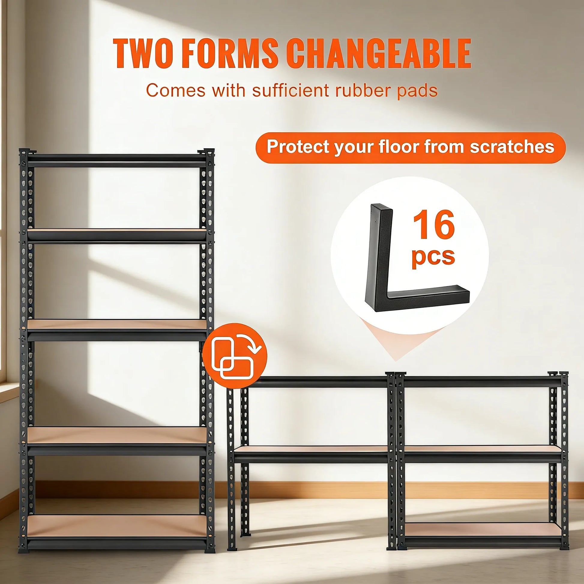 Convertible Design – This shelving unit can be divided into two separate racks for added flexibility. The set includes 16 rubber foot pads to protect your floors and adapt to different surfaces.