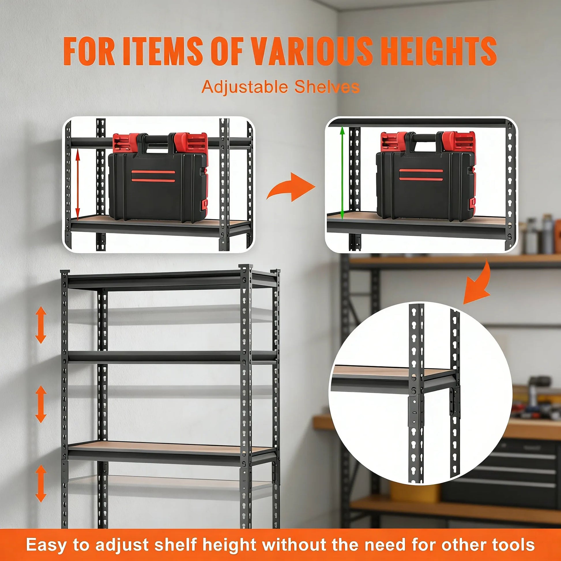 Adjustable Shelf Height – The height of these heavy-duty shelves can be easily adjusted to match your storage needs. Simply slide the shelf to the desired position and secure it with the included clips. Perfect for the garage, kitchen, pantry, and more.