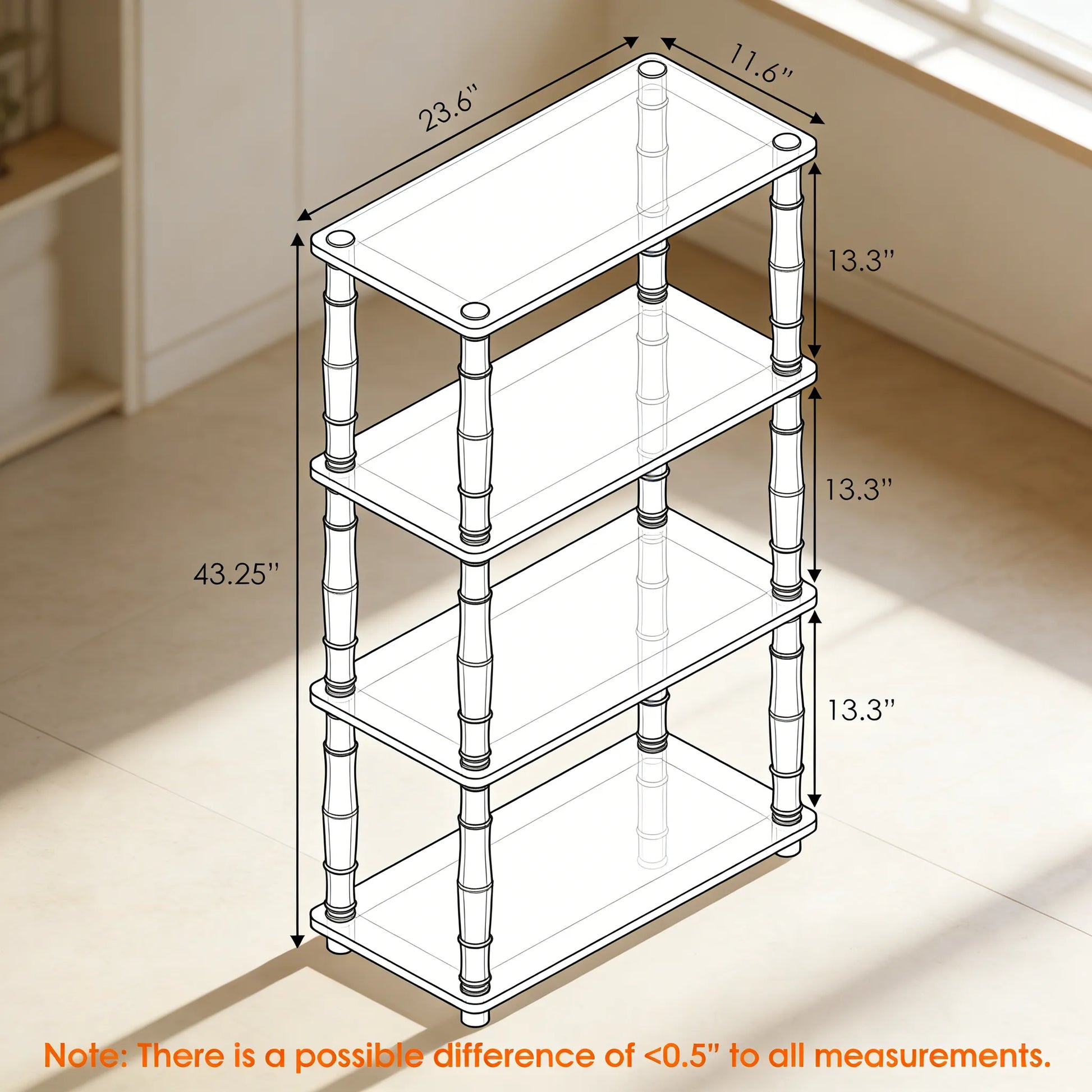 Weight Capacity – Each shelf holds up to 15 lbs, with a total weight capacity of 60 lbs, offering steady support for books, decorative accents, and lightweight bins.