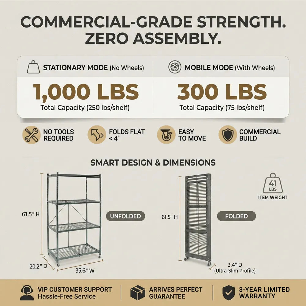 Holds a robust 250 lbs per shelf without any tools. Our 100% pre-assembled rack offers immediate stability for garages, kitchens, and warehouses